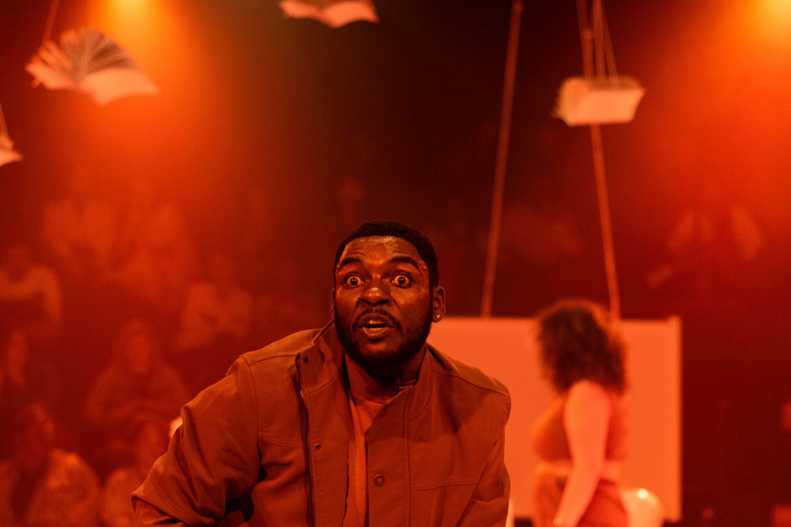 A direção artística de Rodrigo França, seguindo a abordagem contundente que França costuma imprimir em seus projetos, escolheu nos apresentar um espaço cênico impactante – bem realizado por Clebson Prates- , de um branco absoluto e cintilante. Criando um excelente efeito de um mundo dominado imperativamente por brancos: tudo é branco: as carteiras, o piso, a lousa, e os inúmeros livros pendurados- mesmo que ainda toda a concepção cênica tenha como maior objetivo chocar, do que se utilizar dos materiais dispostos nela. Assim também como a boa ideia em colocar parte do publico sentados dentro da cena, nas carteiras, em sala de aula. Outro expediente de grande impacto, que porém fica no meio do caminho; pois mantêm esses espectadores privilegiados, tão passivos como os que estão na plateia. Seria bastante enriquecedor encontrar um bom caminho de tirar esses participantes de seu lugar de conforto, mesmo que estejam dentro da cena, e dar-lhes também, algum espaço de lugar de fala, e de interferência na construção da cena.